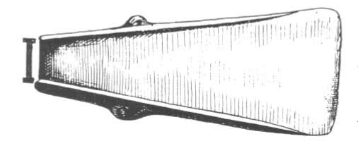 l'existence d'un anneau sur chacun de ses côtés. On connaît des haches munies d'un anneau unique, encore sont-elles en même temps pourvues d'une douille ou d'ailerons. Mais les haches à deux anneaux (en supposant qu'il y en ait d'autres dans le genre de celle-ci, ce qui est probable) étaient inconnues jusqu'à présent, peu connues tout au moins et certainement fort rares. L'utilité de ce double appendice se déduit, du reste, sans peine de la forme et du poids de l'instrument.