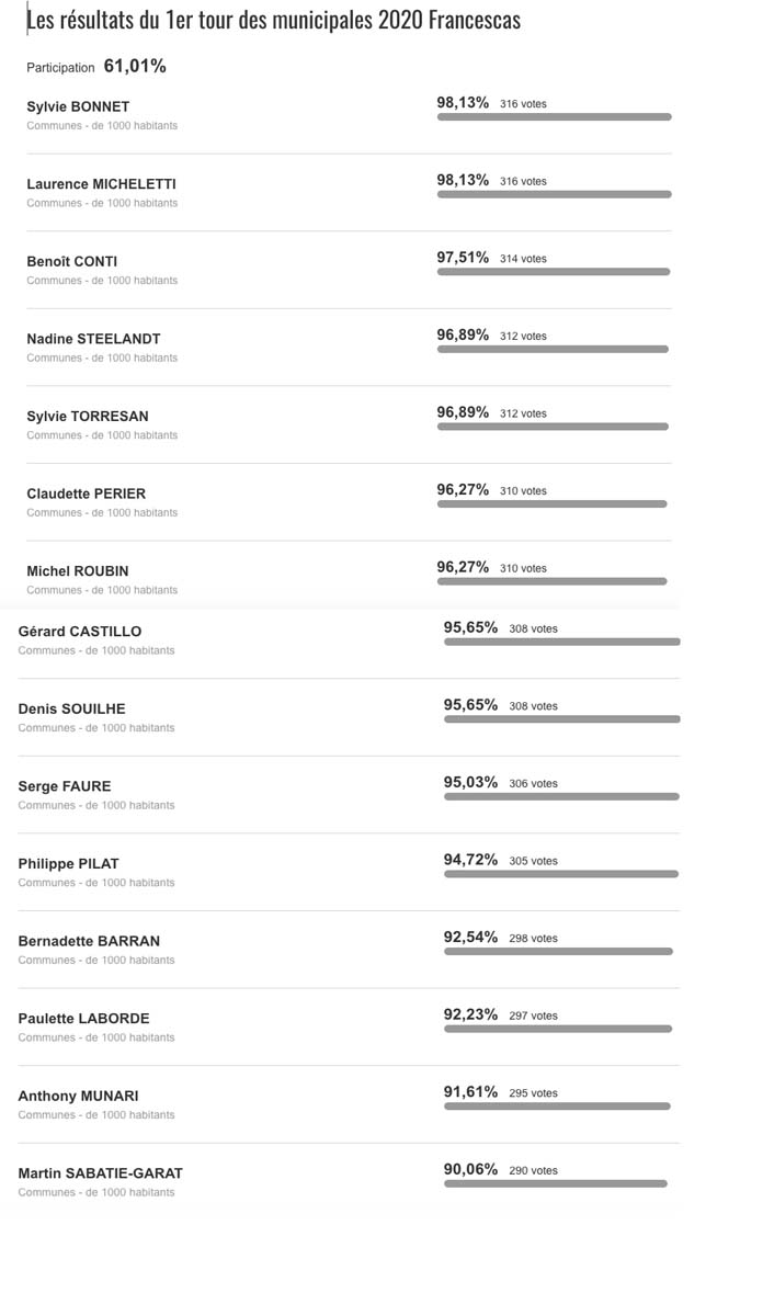 À Francescas, ce sont Sylvie Bonnet et Laurence Micheletti qui sont en tête au premier tour des élections municipales, en totalisant 98,13 % des suffrages. Avec 97,51 %, Benoît Conti arrive en troisième position de cette élection.