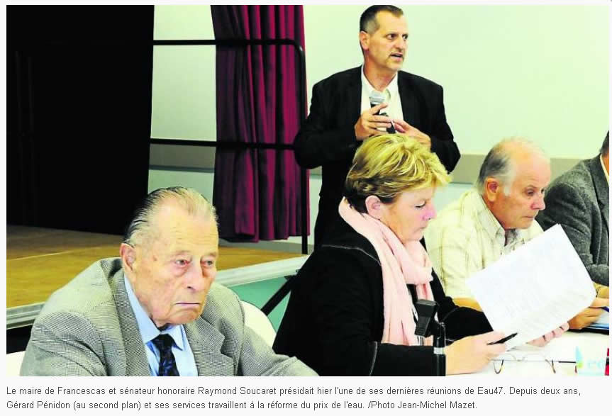 Le maire de Francescas et sénateur honoraire Raymond Soucaret présidait hier l'une de ses dernières réunions de Eau47. Depuis deux ans, Gérard Pénidon (au second plan) et ses services travaillent à la réforme du prix de l'eau. /Photo Jean-Michel Mazet.